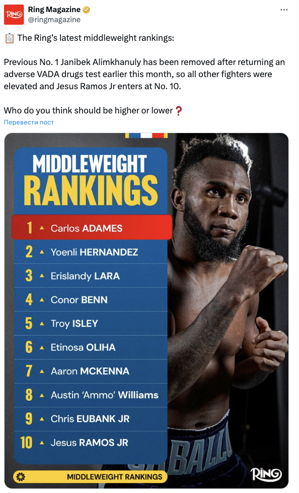 Ring Magazine Танымал бокс порталы орта салмақтағы боксшылардың жаңартылған рейтингін жариялады.